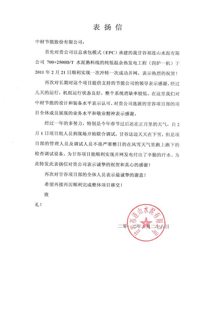 由我公司总承包的甘肃祁连山水泥集团股份有限公司甘谷祁连山公司一条日产700吨+一条日产2500吨水泥生产线配套7.5MW纯低温余热发电项目于2012年2月21日22时顺利并网发电。