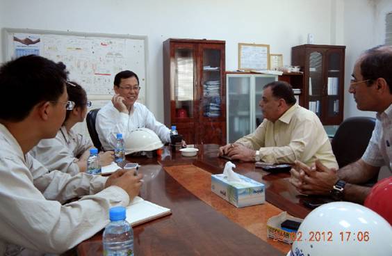 在UCC项目视察期间,胡总裁会见了业主总经理Yasser先生、厂长Ibrahim先生、项目经理Nasser先生,双方在和谐友好的气氛中对项目的未来发展进行了深入细致的交谈, Yasser先生高度肯定了我公司对于UCC余热发电项目所作出的努力及取得的卓越成绩,表示对整个工程的设计水平,设备质量及现场管理都十分满意。Yasser先生表示,在双方的共同努力下,有信心将UCC余热发电项目建成阿联酋乃至整个中东地区的示范工程。