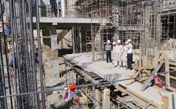在结束了与业主的会谈之后,胡总裁在项目部相关人员陪同下,对现场的每个子项都进行了检查,详细了解了各子项的进度情况、混凝土及钢筋的质量、施工人数及施工设备使用情况,并亲自到汽轮发电机房正在施工的4.5米平面检查工人正在绑扎的钢筋。