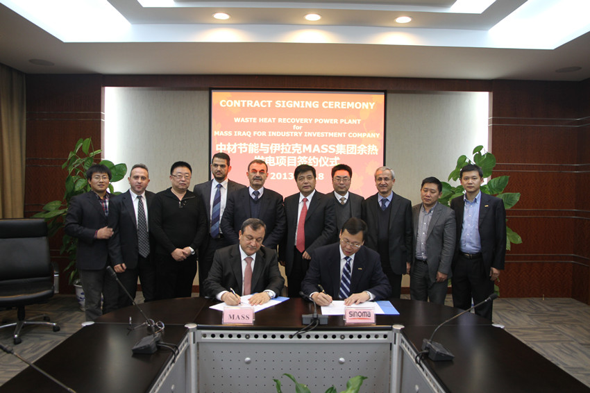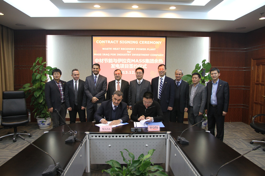 2013年12月18日,中材节能与伊拉克MASS工业投资集团(MASS Iraq for Industry Investment Company)在昆山成功签署了伊拉克首个水泥窑余热发电项目总承包合同。这是中材节能继在承接沙特、阿联酋水泥窑余热发电总承包工程之后,在中东市场上获得的又一重要订单。该项目是利用伊拉克MASS集团旗下的SCP水泥厂3条日产5000吨水泥生产线建设的余热发电项目,该项目总装机规模为25MW。