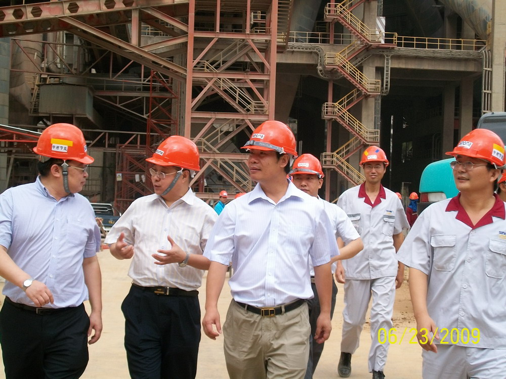 6月,何新平总经理、魏文华副总经理、董兰起副总工程师等一行七人,也赶到京都项目现场检查、指导工作。到现场后顾不上休息,换上安全鞋,戴上安全帽,风尘仆仆视察了循环水冷却塔、化学水处理室、汽轮发电机厂房、SP5锅炉、AQC5锅炉、AQC6锅炉、SP6锅炉等施工工地。何总对每个项目都仔细观察,了解各个环节的关键点及存在问题,在SP5锅炉看到所在位置错综复杂,水泥线的输送从框架中间穿过,并且被水泥线的窑尾、生料磨房、生料输送三面包围,又由于和汽轮发电机厂房相距较近,根本没有锅炉钢架制作场地。就明确指出SP5是京都项目工程中的关键点,加快土建施工速度是首要问题,决不能因为土建而贻误工期。何总在现场与魏总、董总、王品副部长及京都项目吴苏军经理商量后,当场拍板:为了加快施工进度,将钢筋混凝土框架改为钢筋混凝土框架柱,平台改为钢结构形式。对其它各点也进行了精辟地一一阐述……