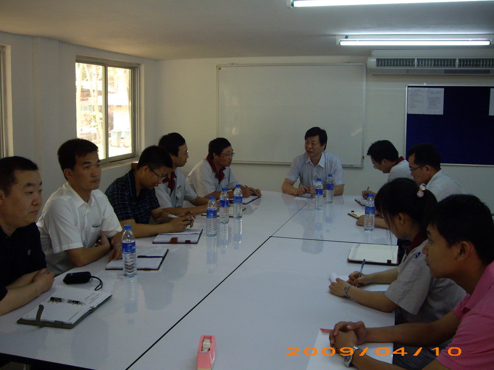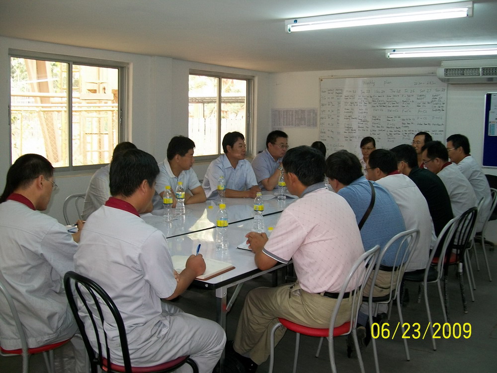4月,泰国传统的颂干节(相当于中国的春节)到来前期,张奇董事长率领市场部、技术部、采购部等部门负责人来到京都项目现场指导检查工作。张董事长不顾旅途劳顿,清晨六点多即离开曼谷赶往项目现场所在地萨拉布里市郊的京都水泥厂。到达项目现场临建办公室后,随即听取了项目经理吴苏军代表现场项目部所作的工作汇报。根据汇报,结合项目当前总体执行情况,张董事长肯定了现场项目部的工作,并且指出,京都项目目前的总体执行情况符合公司制订的计划,要有信心依照总承包合同圆满完成该项目。张董事长同时强调了京都项目的重要性,指示大家对后面的工作要尽早作出计划,对各种可能出现的情况要做好充分准备,要适应业主的管理模式,在保证项目如期完成的同时,提高公司的项目管理水平,树立中材节能更高的企业形象。王毅等三位部长也从各部门角度提出了具体的意见和建议。随后,张董事长一行在项目部全体人员的陪同下查看了现场施工区域。