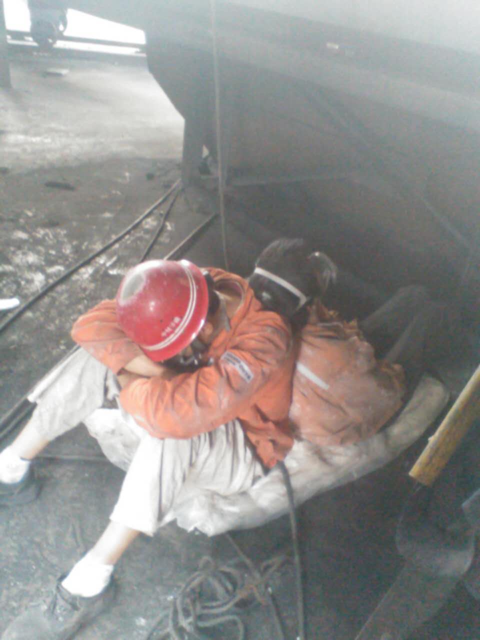 在高温下连续作战二十几个小时,他们已经筋疲力尽,实在太困了,就在换班的间隙,互相依偎睡着了……