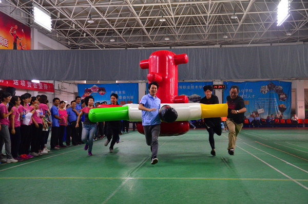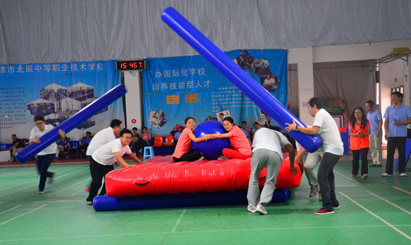 比赛高潮一浪高过一浪。车轮滚滚项目比赛把赛事推向了最高潮,该项比赛不仅拼速度,拼协作,还要拼认真细致。2人坐在气垫上面保护气球不掉下去,4人往前推气垫前行,2人还要不停的抽换柱子(相当于车轮),如果配合不好,要么气垫着地,要么车轮变换不及,要么气球会掉下气垫。最终技巧与配合默契的设计二队获得该项比赛的第一名。
